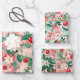 A bright pink red floral Christmas pattern is based on a retro design like those popular in the last midcentury, 1950s. Mixed in with the lovely floral elements are cute matching and contrasting baubles and ornaments. All these resting amidst emerald green leaves and other foliage. Each of the three sheets of wrapping paper bears a different, but compatible, design.