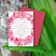 This summer wedding invitation showcases an attractive floral pattern, consisting of a wreath adorned with rose and dahlia flowers and foliage in shades of pink and red. The reverse side of the invitation is coloured in a red-pink hue.