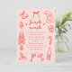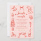 Featuring hand-drawn holiday icons — Santa, champagne glasses, candy canes, and more — in cheerful coral pink tones, this invitation sets the perfect mood for your Christmas or New Year’s bash.