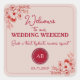 Welcome your guests in style with this elegant pink and red Wedding Weekend welcome sticker, perfect for creating a beautifully organized refreshment or essentials station. Featuring delicate floral line art, a bold wedding-weekend header, and a personalized monogram, this label helps guide your guests to treats, hydration, and recovery items throughout the celebration.