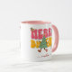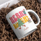 Retro groovy typography customizable script coffee mug. The design features the text "Merry Bright" in pink and yellow groovy typography with kawai-themed elements like Christmas tree, colourful santa and stars. The name can be easily customized. Makes for the best personalized gift for yourself, your friends, family members and even neighbours. We have 45+ more Christmas designs in retro, watercolor and funny typography-based themes in our collection that you will definitely love. Merry Christmas!