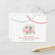 A vintage inspired wedding save the date postcard featuring an illustration of a pink retro trailer with window box of colourful flowers. Red and blue bunting at top. Personalize the text with your information.