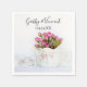 The elegant Pink Rose Flowers in Teapot Wedding Paper Napkins can be personalized with the names of the bride and groom and date for use at your fancy garden tea party bridal shower or marriage cocktail party and reception. These classy custom disposable high tea napkins feature a floral photograph of a flowery tea pot filled with pink roses and white satin.