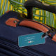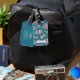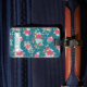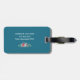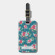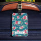 Dark teal luggage tag with a pattern of pink roses, blue flowers, and cherry blossom. Personalize with your name on the cover, and name and address on the back.