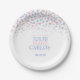 Beautiful stylized graphic confetti scattered dots add your own wedding names and wedding date paper plates. A great personal addition to your wedding tables or for after wedding drinks or a wedding after party. Personalize with your bride and groom's names. Perfect for a pink rose quartz and serenity blue themed wedding, engagement, or anniversary. Original art and design by Sarah Trett.