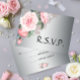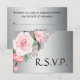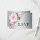 A modern pink and silver wedding RSVP with a traditional touch: a beautiful bunch of pink roses in the top left corner. In the background there is a shiny silver metallic base. The reverse also has a tiny pink rose bouquet at the bottom.