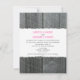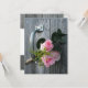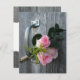 A wedding invitation featuring a photo on front of a small bouquet of pink roses and greenery wrapped with burlap twine. Bouquet rests in the handle of a barn door. Personalize the opposite side with details of your occasion.