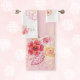 Transform your bathroom into a haven of romance and luxury with our floral towel set in pink, featuring watercolor roses in pink and yellow, intricate lace doilies, and a touch of timeless elegance with a string of pearls.