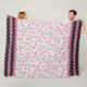 This beautiful blanket has a background of white with small black polka dots. The foreground has beautiful pink roses scattered about. Each end has a border of black with white polka dots and pink stripes for a fun accent. This would make such a stylish blanket for a college dorm room. A matching throw pillow, pillow case and other items are also available!