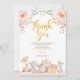 This adorable thank you card features cute safari animals wearing girly flower crowns on their heads, standing next to a pretty pink teepee adorned with watercolor blush roses and soft greenery. If you wish to change the fonts, font colours, or rearrange the text placement, simply click the "Customize Further" button.