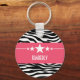 Trendy and modern Sassy Star Zebra Keychain featuring a chic black and white zebra print background and a bold magenta border adorned with a fun star motif. This girly design may be customized with the personalized text of your choosing. Click "Customize It" to find more personalization options.