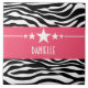 Trendy and modern Sassy Star Zebra Tile featuring a chic black and white zebra print background and a bold magenta border adorned with a fun star motif. This girly design may be customized with the personalized text of your choosing. Click "Customize It" to find more personalization options.