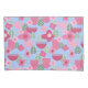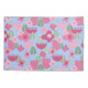 This pillowcase has a Scandinavian design of flowers and leaves in various shades of pink and green on a field of blue.