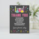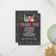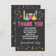 Girls science party thank you card in pink, purple, teal, yellow and green.