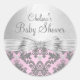 Baby Shower Sticker. Pink & grey damask with silver bow & diamonds. Exclusive Zazzle. Customize with your own details. PLEASE NOTE all flat images! They Do NOT have real Bows, Diamonds or Jewels!!