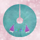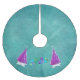This tree skirt is teal with two shiny pink and silver trees on a white star with the text Merry Christmas in colourful festive letters on a teal background.