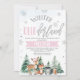 Cute pink and silver woodland winter one-derland themed first birthday invitation featuring four cute woodland animals, some pine trees, a pink banner, a decorative silver glitter heading and snowflakes. This girl's woodland winter one-derland birthday invitation also features some silver glitter dots and a striped pink and silver back.