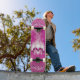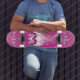 Trio of flaming skulls designed in hues of pink set upon a pink patterned background. Text on top reads "Girly Skate" and bottom text reads "Girls Rule!"
