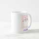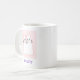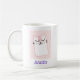 A mug with an illustration of a cute sleeping kitty cat. Eyes closed looking happy and peaceful. Set on a pale pink background.