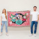 Beautiful Christmas holiday throw features three adorable penguins in ice skates, sweaters, striped scarves, and winter hats on a background of pink and black with snowflakes and polka dots of white and an area you can easily personalize with your family name!