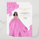 Pink quinceanera fashion illustration invitation card for quince parties. Pink Spanish quinceanera invite with gold foil. Add your information to this simple and elegant invitation. An ideal invitation that will match the pink dress of the quinceanera.