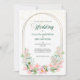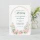 A double oval gold frame is decorated with pastel pink flowers and soft green leaves at the bottom of this pretty wedding invitation. Your custom text is in matching green and gray in the center. The top third also has a sparkling gold confetti spray. The images and text are placed on an elegant white background. The back of the invitation is matching pastel pink, with the same confetti overlay. Beautiful, modern, and chic! *Thanks to LABF Creations for the floral images in this design.