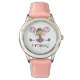 A stick figure cheerleader in a pink uniform with pink pom poms and text that reads I Love Cheering on a watch that has several style and colour options to choose from.