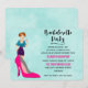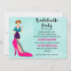 Une invitation à la fête de bachelorette avec une chaussure en talon rose et une illustration d'une fille de fête tenant un verre. Des confettis roses et violets parsemés le long du sommet donnent un aspect festif. Placez-vous sur un arrière - plan d'aquarelle vert.