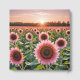 A vibrant field of pink sunflowers stands tall against the backdrop of a setting sun which casts a warm glow over the petals and leaves.