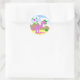 Pink T-Rex Dinosaur Name Stickers. An adorable cute little pink cartoon T-Rex dino Tyrannosaurus Rex in a pre-historic stone age landscape with palm trees, mountains and vulcano shooting colour stars in a beautiful blue sky with white clouds round sticker with Your Name. Fill in your name to personalize your unique special T-Rex dinosaurs stickers with your name! This Tyrannosaurus Rex dinosaur sticker is fully customizable, add your texts and image(s). Great back to school dinosaur stickers or birthday gifts and presents stickers for the little/ big dinosaur fan!