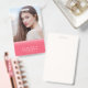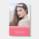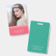A chic modern photo badge featuring a pink layered design on the front where you can also add your photo and a teal colour back side. Perfect as an office badge for your staff and also a great way to introduce yourself at meetings or events.