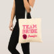 Fun wedding party canvas tote bag with pink graphic distressed text reading Team Bride. Custom pink script text, on the bottom, is ready to personalize for the whole bridal party. Digital graphics of a pink rose bloom decorates the bottom left. Perfect for holding all the important little things the bridal party members can't forget.