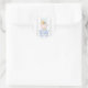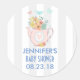 Personalized stickers for a baby shower or other event. A whimsical illustration. A pink teapot with a little pink heart in the centre and a bouquet of flowers inside. Delicate pastel coloured butterflies fluttering about. Set on a grey and white striped background.