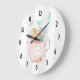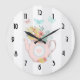 A clock with a whimsical illustration. A pink teapot with flowers inside. Delicate pastel coloured butterflies fluttering about. Set on a grey and white striped background. Art deco clock face.