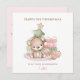 Christmas card with an adorable teddy bear, Christmas tree an gifts in pink for baby girls and little girls. Easily personalize this Christmas card with your own text - Kate Eden Art.