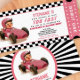 Delight your little speedster with our unique Pink Racing Car Birthday Invitations, perfect for any girl's birthday bash! Crafted to resemble a classic 'Admit One' ticket, each invite showcases a charming illustration of a little girl zooming away in his blue race car. The background features a striking black and white chequered pattern, mirroring the iconic finish line flag in auto racing.