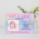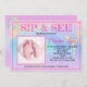 This new baby "SIP & SEE" invitation features a colourful swirl of purple, peach, green, and blue with hints of pink on the top and bottom. You can also replace the template baby feet photograph with a square photograph of your baby or leave it as is. Fill in the personal information template fields, remove text and/or click customize to select a typeface colour, size, and style your prefer.
