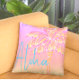 This classic tropical shades of an island sunset pillow is a summer staple. Add a colourful palm tree and Aloha and it becomes a tropical vision! You can change the text to whatever you want. A stunning addition to your outdoor living area. Perfect for the pool, beach, garden, ot anywhere you need a tropical vibe. These pillows are also available in indoor fabrics as well as outdoor fabrics, 3 styles/sizes to choose from.