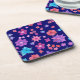 A set of cork-backed coasters, with a pattern of flowers in purple, turquoise, pink and orange on a Midnight Blue background, from a handpainted paper collage by Judy Adamson. You can easily change the background colour, if you wish, by using the Edit button.