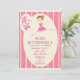This customizable girls birthday party Invitation features a little ballerina wearing a pink tutu and pink ballet slippers. On a pink striped background and customizable text.