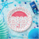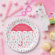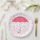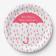 Custom baby shower paper plate, with graphics of a pink raindrop pattern and a big coral pink umbrella. Personalize the white text to read what you want. Matching invitations and other party supplies are available.