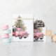 Pink Vintage Truck and Panda bear wrapping paper. Watercolor drawing of a cute white panda bear in a pink vintage truck and Christmas trees with baubles.