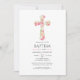 Watercolor girly pink floral cross baptism invitation designed to be quickly and easily customized to your event specifics.