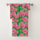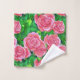 Towel set in a pattern of watercolor roses, in shades of deep fuchsia to pastel pink, against a background of green leaves