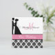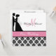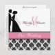 Black and white damask print with a pink band, a silhouette bride and groom, and areas you can personalize with your names, monogram initial, wedding ceremony and reception information on a customized wedding invitation that's classy and traditional all in one! Scroll down for matching wedding seals.