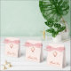 A pink favour box for a wedding with blush pink and rose gold wedding colours. On the flap, it has rose gold crest with a monogram in it.