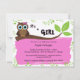 The design on this whimsical "it's a girl" baby shower invitation features an adorable blue-eyed owl wearing a pink bow. She is sitting on a tree branch as vines weave around to complete the look. There is plenty of customizable text for you to add your party information. We also have this design available in blue!