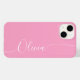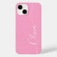 Pink Elegant White Calligraphy Script Custom Personalized Name iPhone 14 Smart Phone Cases features a modern and trendy simple and stylish design with your personalized name in elegant hand written calligraphy script typography on a pink background. Designed by ©Evco Studio www.zazzle.com/store/evcostudio