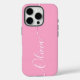 Pink Elegant White Calligraphy Script Custom Personalized Name iPhone 16 Pro Smart Phone Cases features a modern and trendy simple and stylish design with your personalized name in elegant hand written calligraphy script typography on a pink background. Designed by ©Evco Studio www.zazzle.com/store/evcostudio