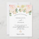 A chic white background. Decorated with watercolored flowers, florals pink roses, white orchids and a yellow gerbera, eucalyptus greenery and faux gold sprigs. Personalize and add your names and wedding details. Black coloured letters.